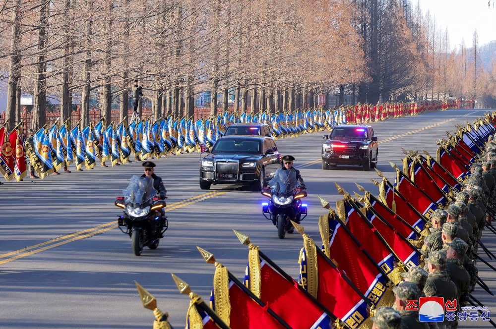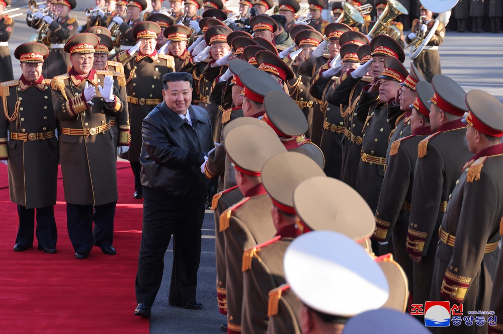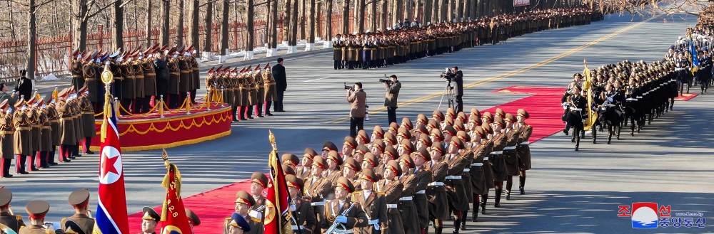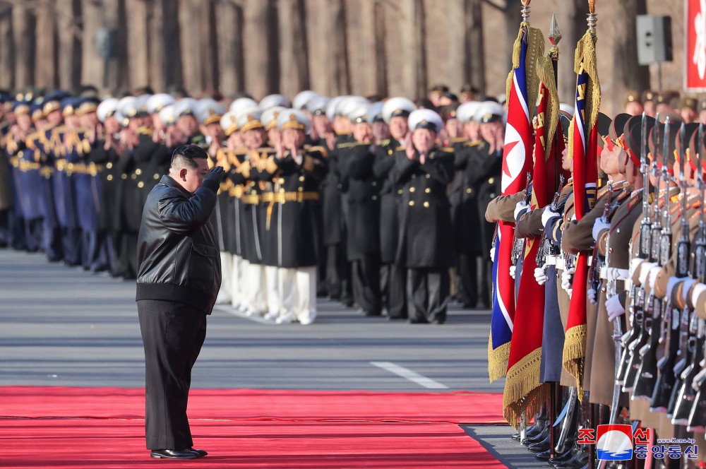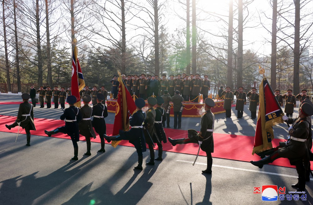 金正恩同志接到朝鲜人民军仪仗队队长的迎接报告后,检阅了仪仗队和陆海空三军的光荣军旗。