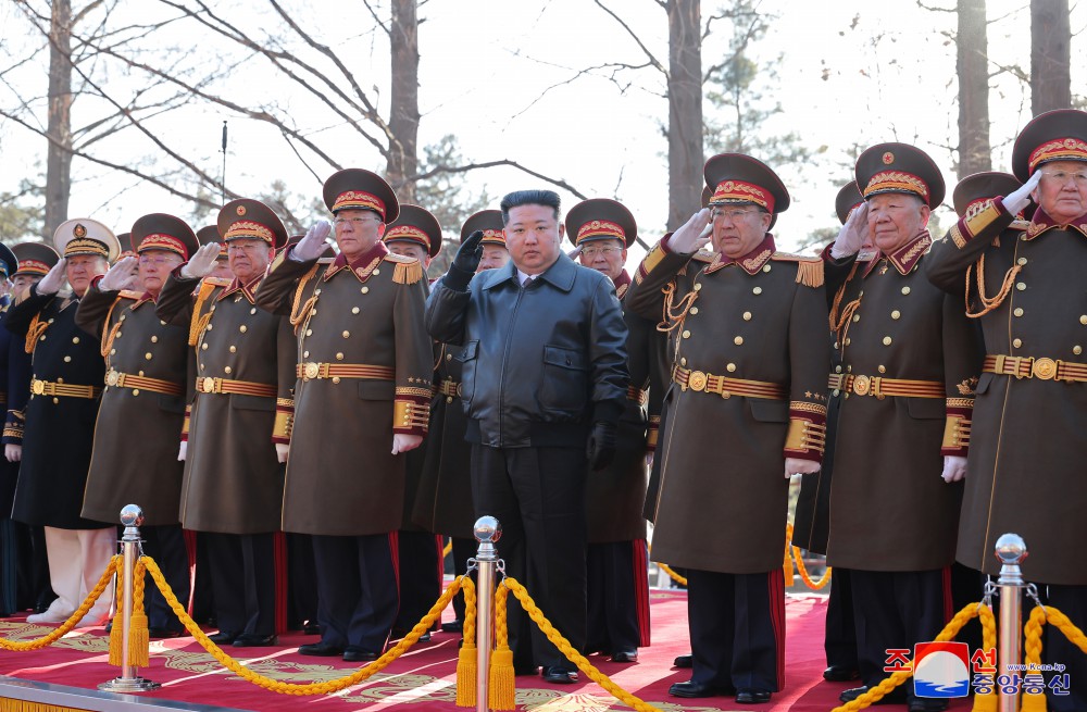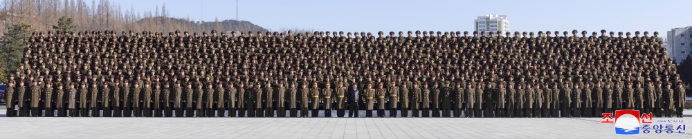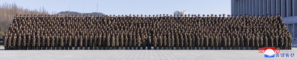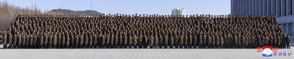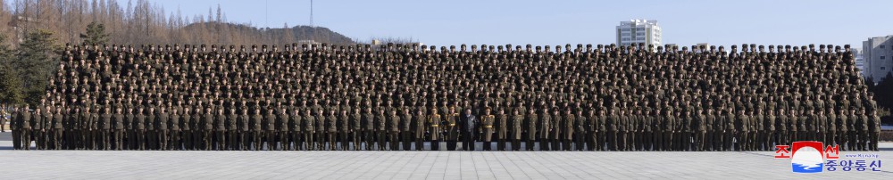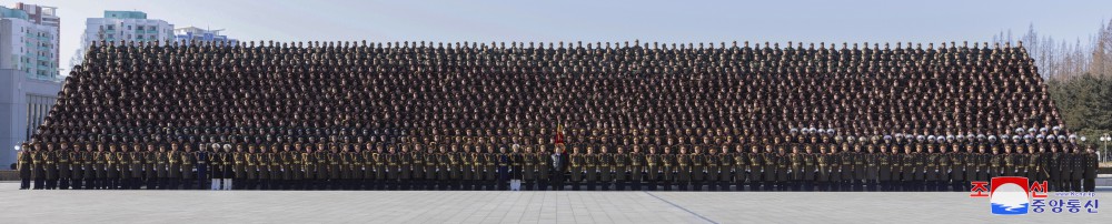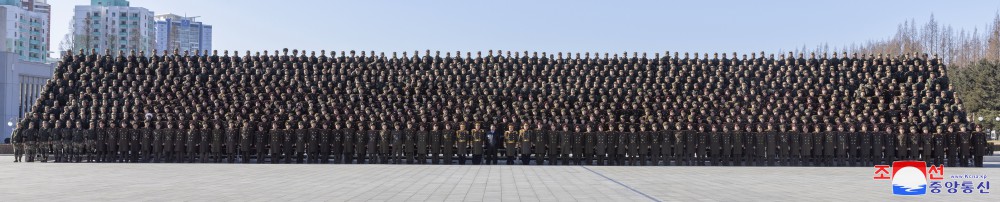 金正恩同志同国方省指挥员和直属部队官兵、朝鲜人民军各军种及各级大联合部队和所属联合部队、部队的军政指挥员合影留念。