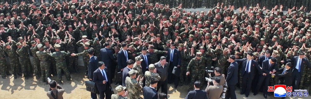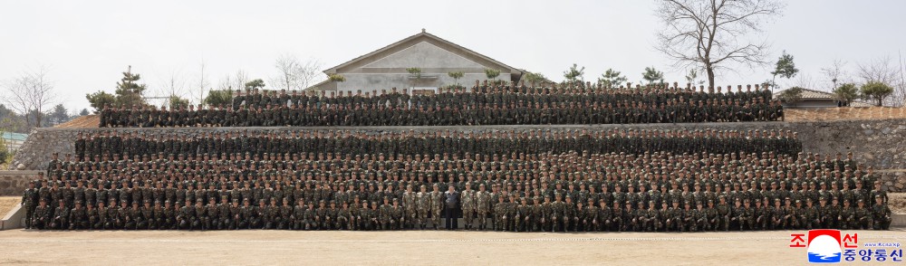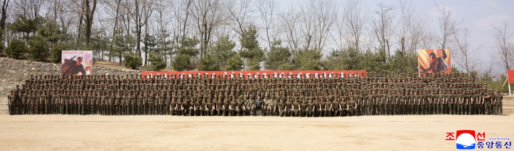金正恩同志赞赏官兵们怀着毫不犹豫地应对任何战争和危机的勇气胆略和冲天自信,在训练中更加巩固完善最强实战能力,并同他们合影留念。