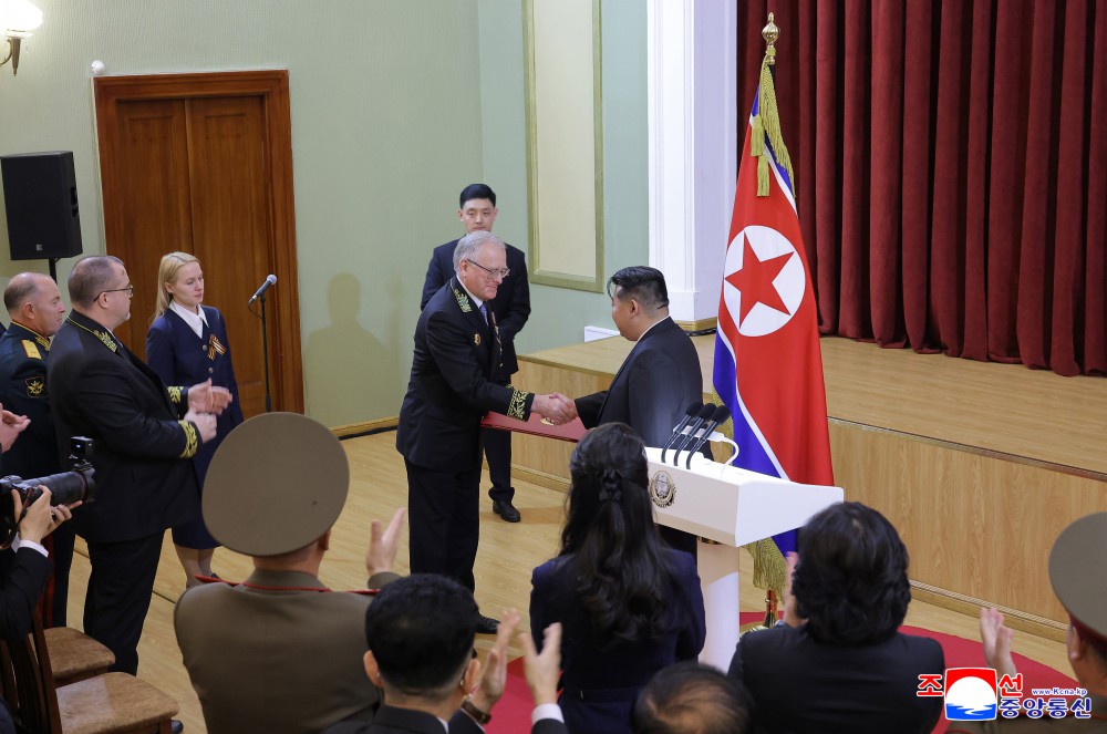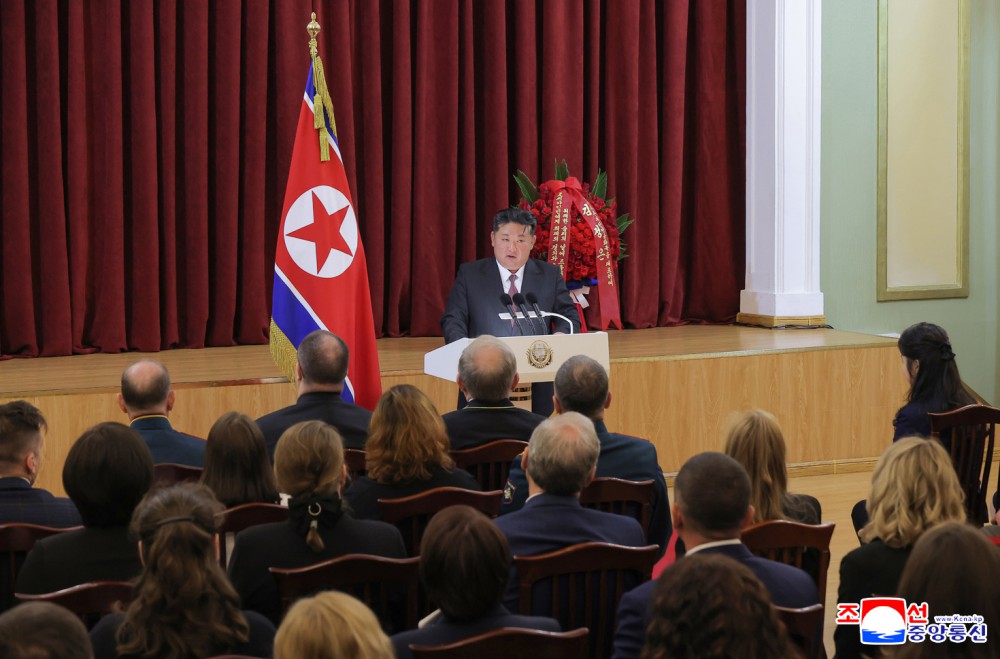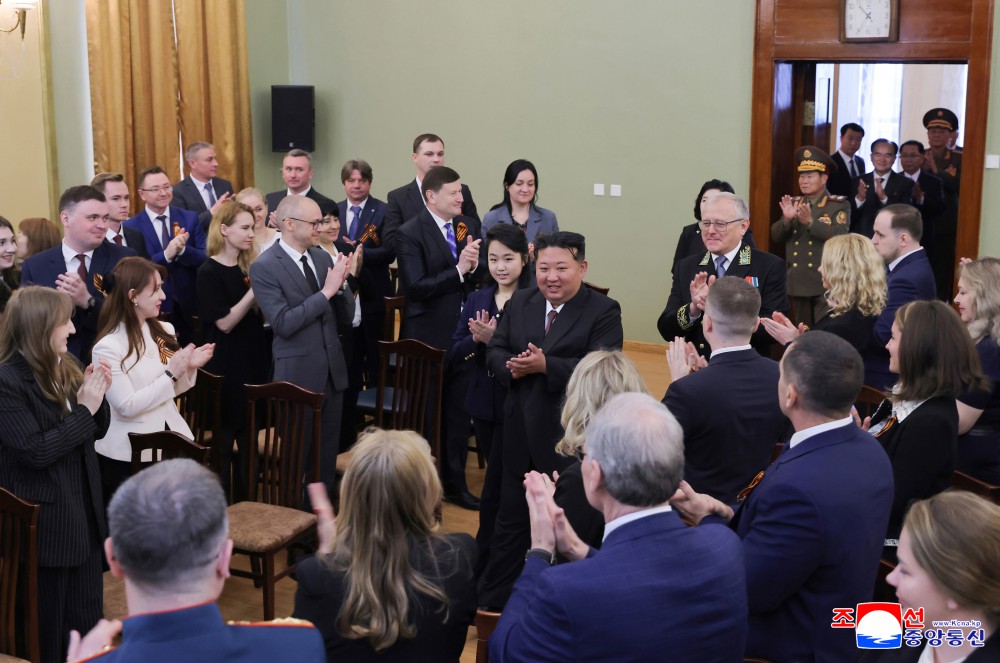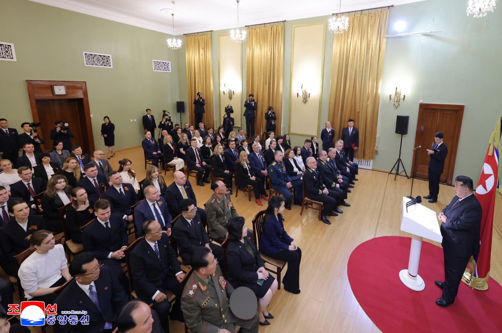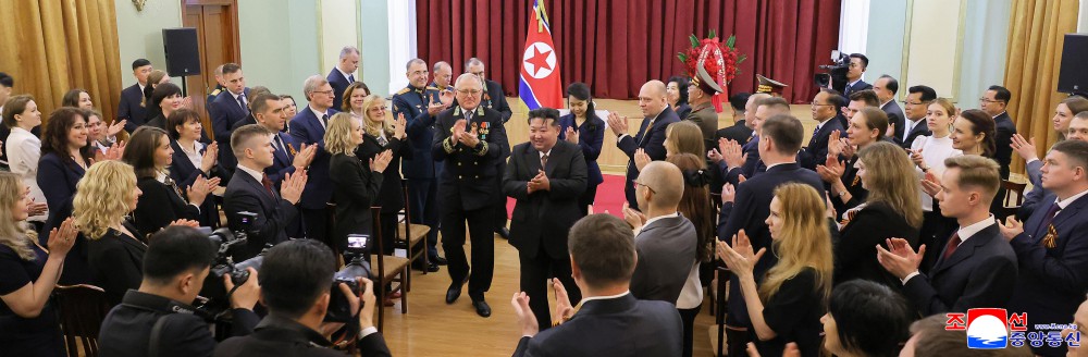 场内掌声热烈,金正恩同志亲自向特命全权大使转递了朝鲜劳动党中央委员会、朝鲜民主主义人民共和国国务委员会、朝鲜民主主义人民共和国最高人民会议常任委员会、朝鲜民主主义人民共和国内阁致俄罗斯联邦领导层和全体俄罗斯人民的共同贺信。