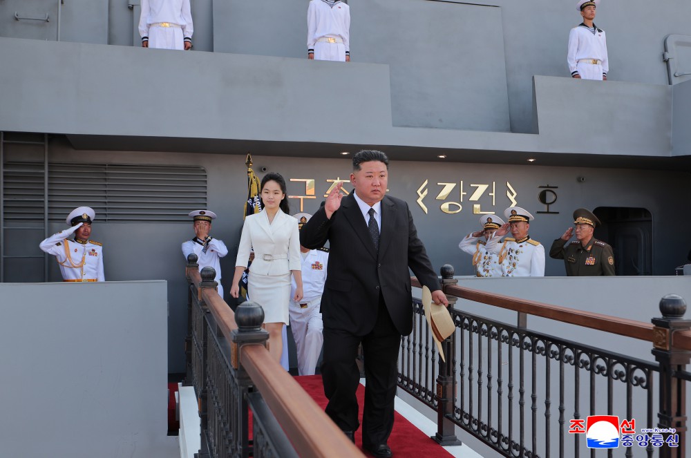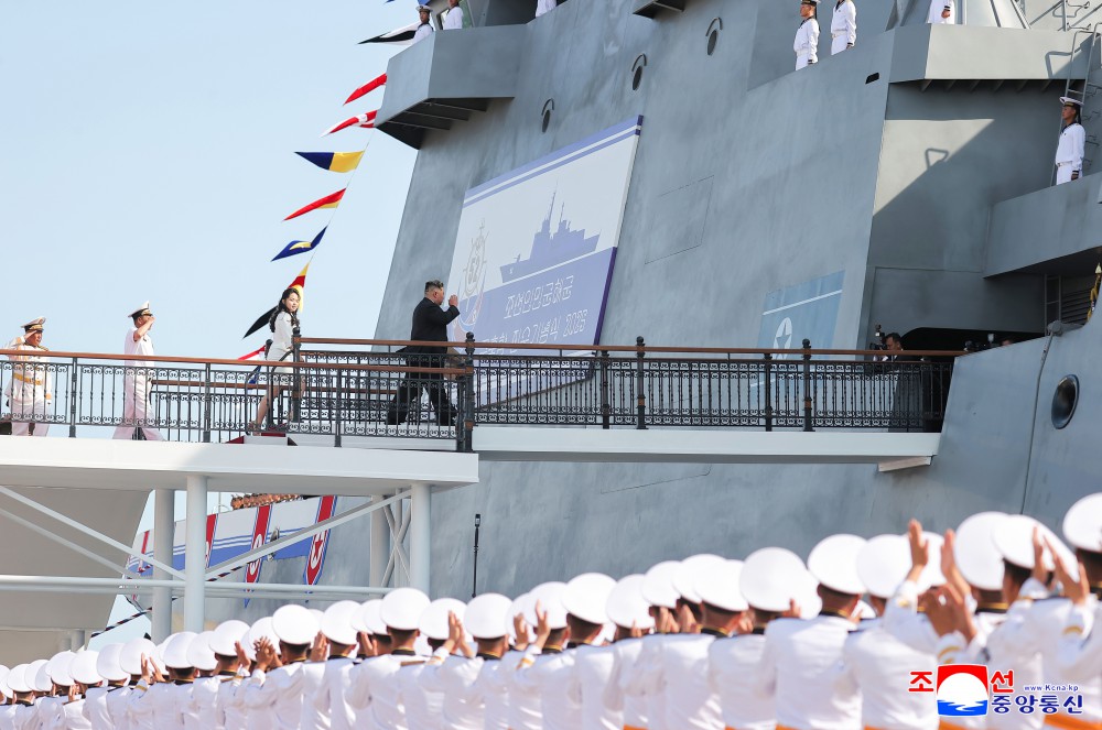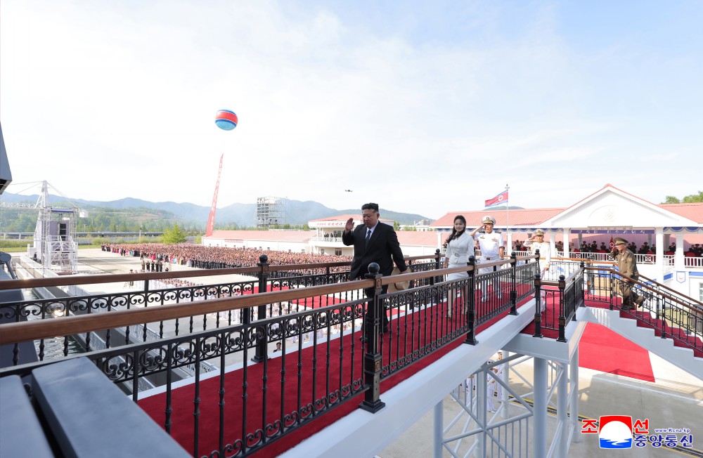 敬爱的金正恩同志抵达新锐多用途驱逐舰大显雄姿的下水典礼场时,全体参加者仰望着举世无双的爱国者、百战百胜的钢铁统帅爆发出热烈的欢呼声,致以最大的光荣和敬意,礼赞他为实现祖国的繁荣昌盛和维护子孙万代的平安,以伟大的奋斗和钢铁意志开辟无人走过的艰难道路,令人心满意足地实现五千年民族史上的夙愿,开创海洋强国建设全盛期。