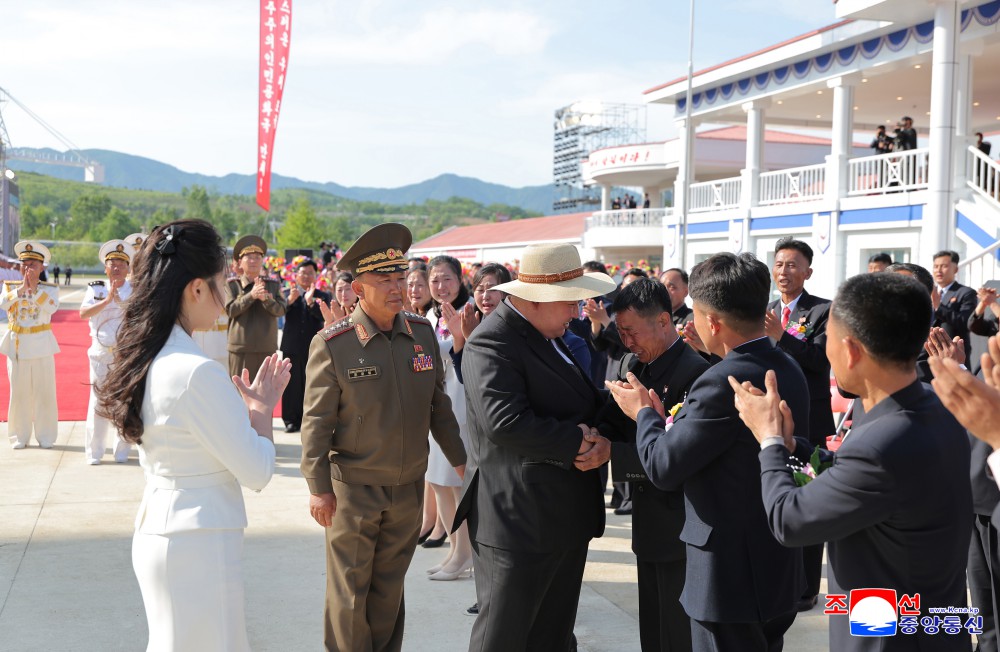 金正恩同志同有功人员一一握手,表示衷心感谢,赞赏他们一致奋起投入建造新一代战舰及其修复工程,充分发挥优秀的专业资质和能力,为完美无缺地贯彻落实党中央军事委员会命令做出贡献的爱国忠诚和劳动殊勋。
