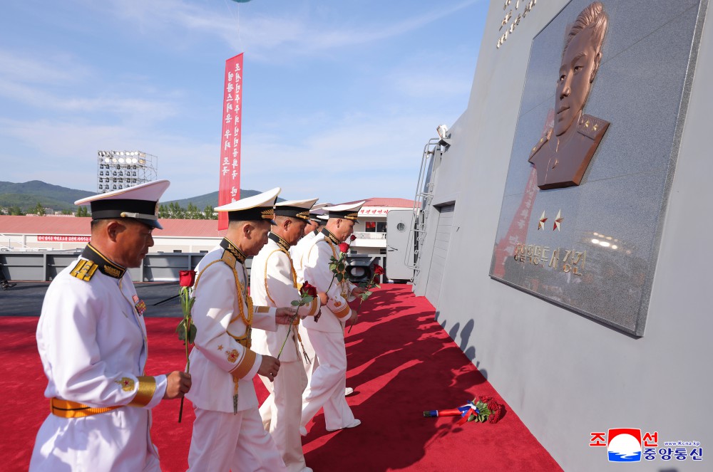 金正恩同志祈愿,代表朝鲜人民军英雄气概的出众的军事家、真正的共产主义革命家姜健同志为建国、建军大业献出的青春和他在南征时所发挥的刚勇气概和宝贵精神将成为该驱逐舰的推动力、“以一当百”战斗精神的永恒源泉,鼓舞新一代水兵始终留下胜利的航迹,勉励共和国海军的无穷繁荣,并向建军功臣的纪念像献花,表示崇高敬意。