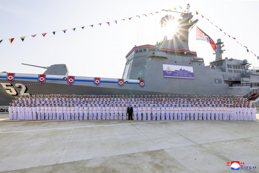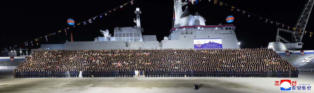 金正恩同志向驱逐舰的主要指挥员们授予纪念铜币,以驱逐舰“姜健”号为背景,同将在驱逐舰服役的指挥员、水兵一起合影留念,在建军史上留下难忘时刻。