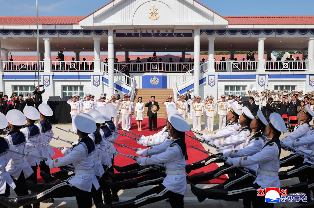 金正恩同志检阅了朝鲜人民军海军的光荣军旗和仪仗队。