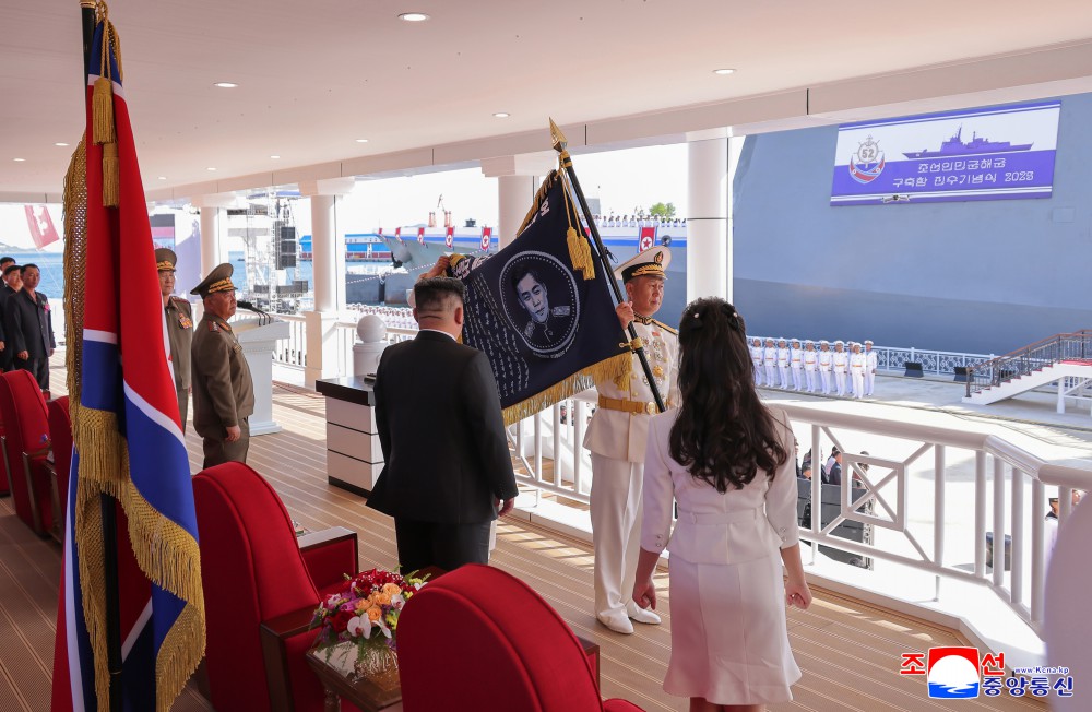 金正恩同志向朝鲜人民军海军东海舰队指挥员授予了“姜健”号军舰旗。