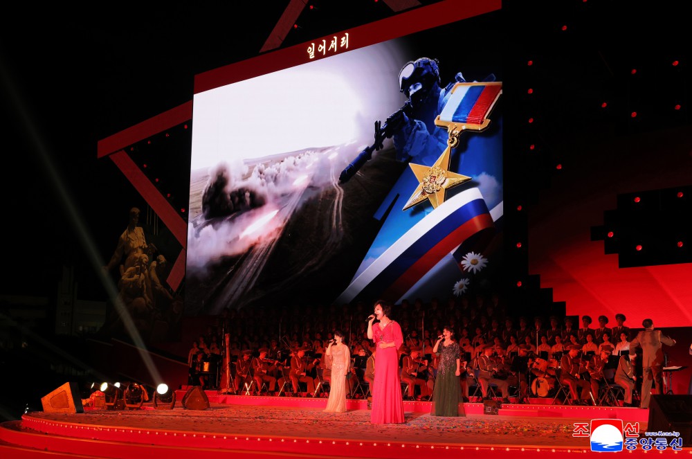 全民性的领袖颂歌、革命歌曲和爱国主义主题的名曲等精彩节目登上了舞台。一首首革命歌曲和抗日战争时期的歌曲塑造在朝鲜革命史上掀开首页的抗日先烈的英雄形象,使在场观众肃然起敬,沉浸在难忘的回忆之中。