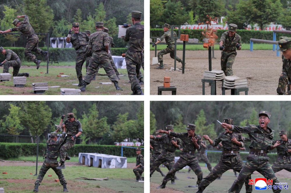 金正恩同志接着观摩了特战部队战斗员的综合特殊体育训练。参训战斗员充分显示了他们作为攻无不克战无不胜的战斗部队、革命劲旅的尖兵练就的体力技术能力。金正恩同志对遵循党的特战兵力建设思想,始终心存战场,为尽到祖国和人民赋予的崇高使命与本分专心一志的全体战斗员透彻的思想精神予以高度评价,并同他们合影留念。合影结束后,全体战斗员爆发出雷鸣般的欢呼声,表达了要誓死保卫以伟大的金正恩同志为首的党中央委员会的忠诚誓言。