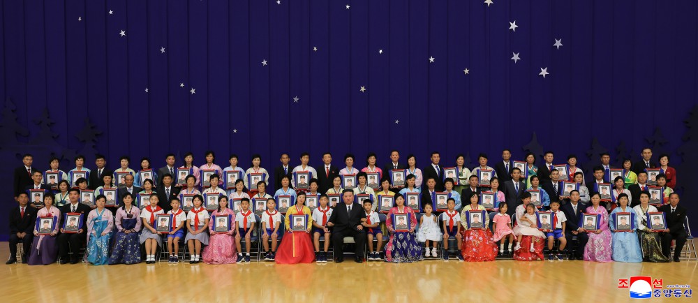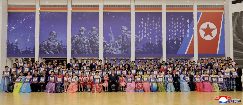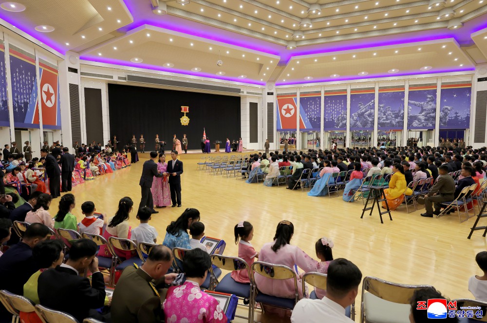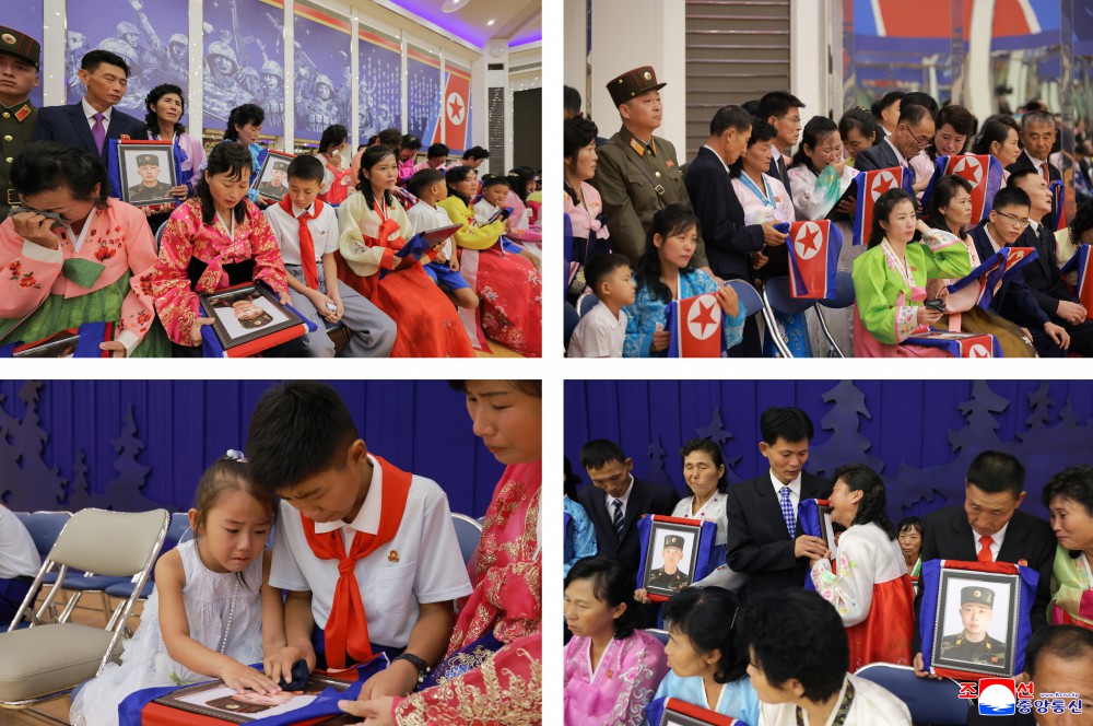 金正恩同志向烈属一一授予了被英雄战士们用生命捍卫其尊威与名誉之光芒的神圣而光荣的旗帜朝鲜民主主义人民共和国国旗裹起来的烈士遗像。场内展现出一幅崇高的关爱与道德情义的感人画幅。