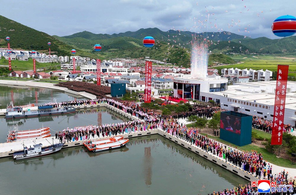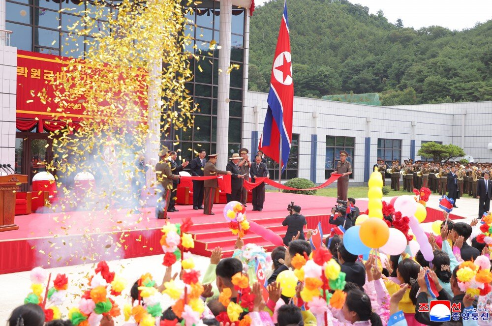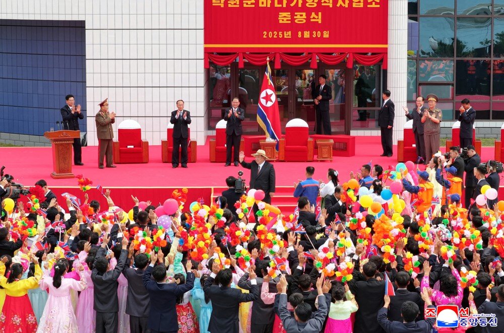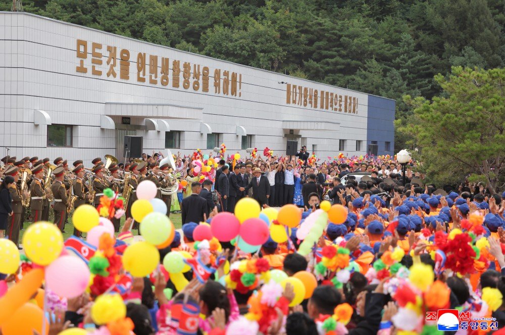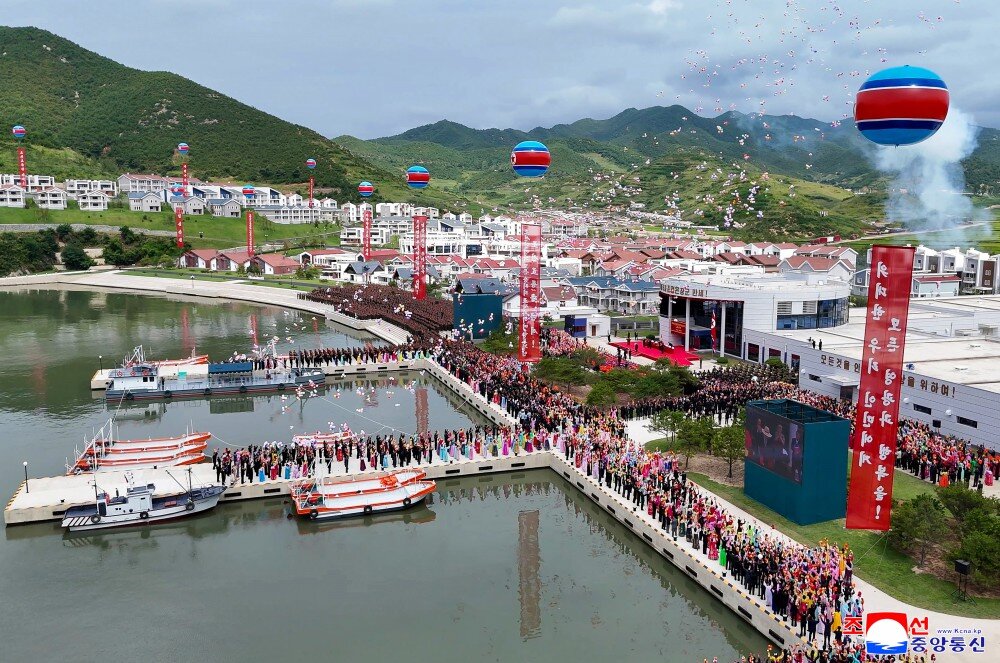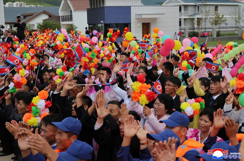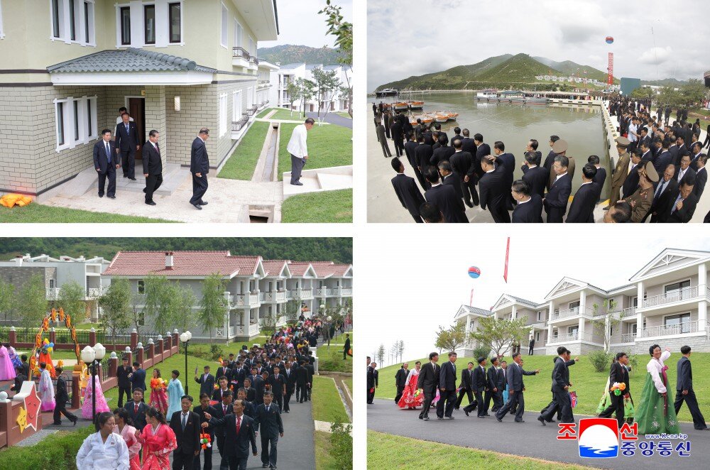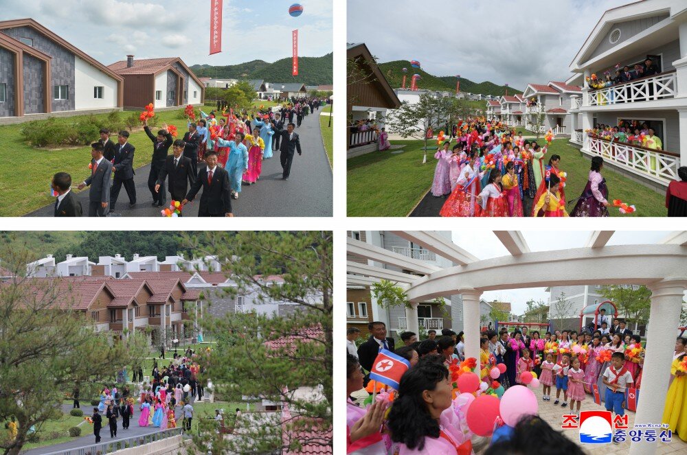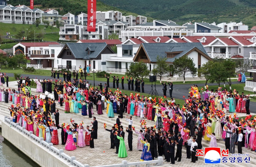 竣工典礼场所洋溢着乐园郡居民即将享受新生活、新文明的莫大欢喜以及军人建设者按照我们的方式建设理想渔村赢得人民幸福的创造者之声誉的无比自豪。