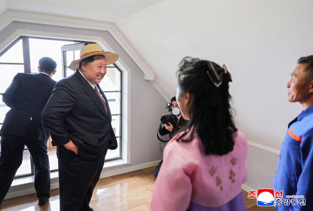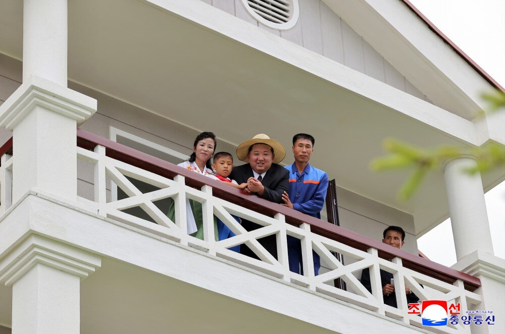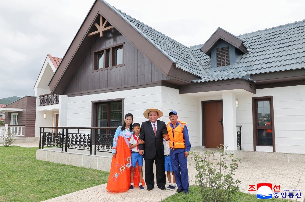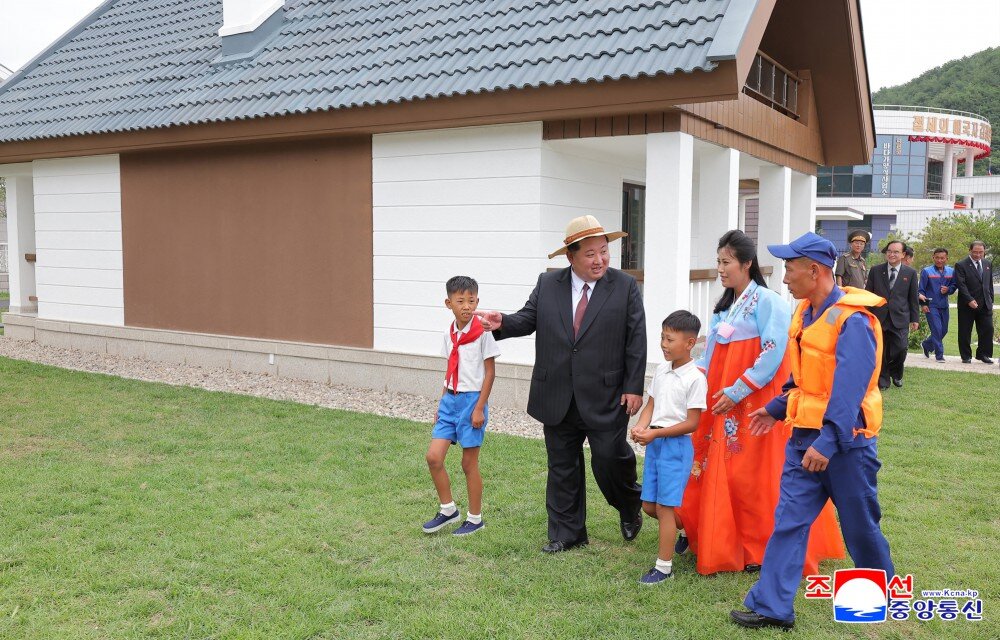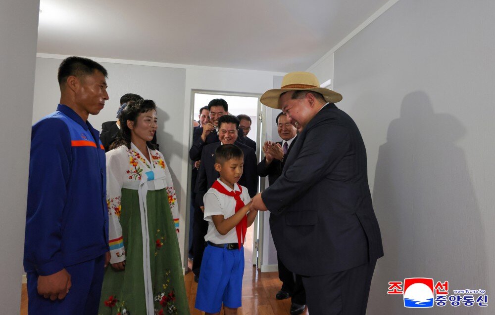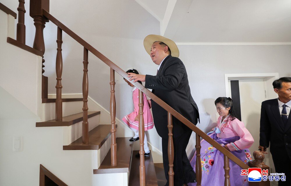 金正恩同志察看多个房间,祝贺他们当上乐园渔村的堂堂主人,鼓励他们为推动郡的经济发展而挑梁扛柱,成为建立功勋的劳模,并以新住宅为背景合影留念。
