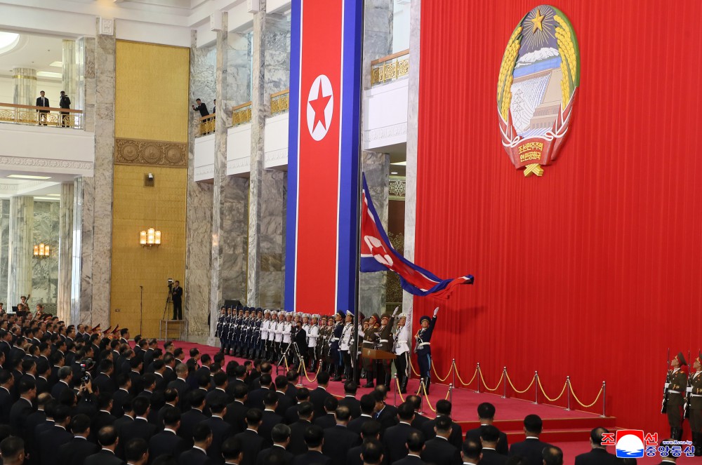 朝鲜民主主义人民共和国国歌庄重奏响,光荣的国旗冉冉升起。