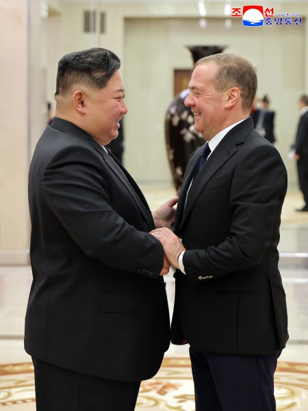 金正恩同志热情迎接梅德韦杰夫同志,在同志友好的气氛中进行了谈话。