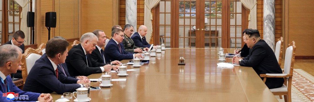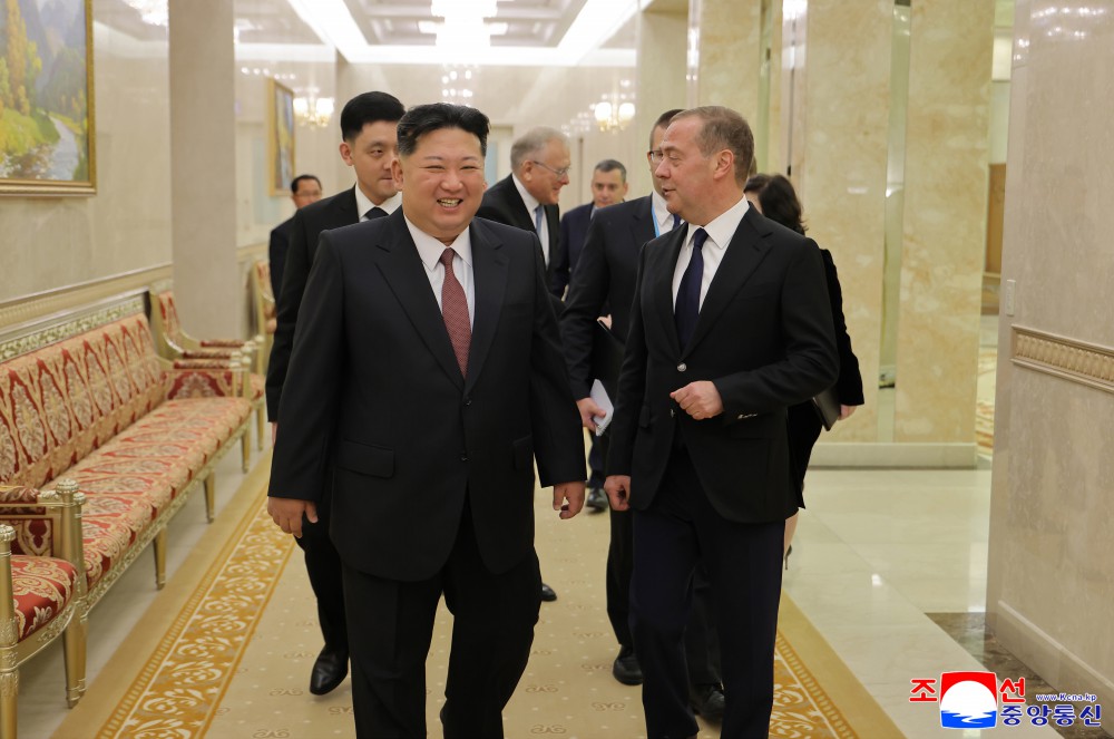 金正恩同志热烈欢迎梅德韦杰夫同志访问平壤,说,统一俄罗斯党代表团的此访是贵党和贵国人民对我们党和我国人民正义事业的坚定支持和声援的表现,也是把更上一层楼的朝俄关系更加蓬勃地扩大和发展成为强有力的全面战略伙伴关系、同盟关系的意义重大的契机。