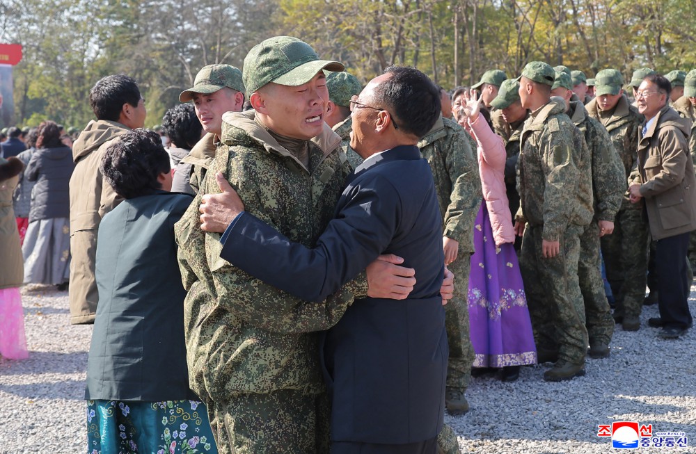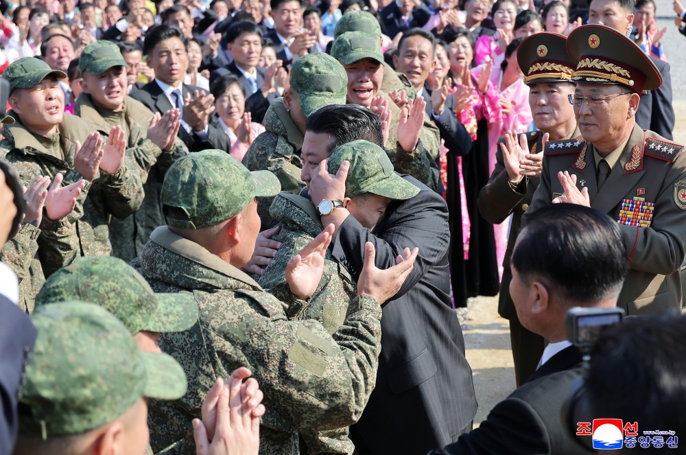 金正恩同志会见参加奠基典礼的海外军事作战参战军人,一个个地拥抱他们,勉励恢复健康的他们。