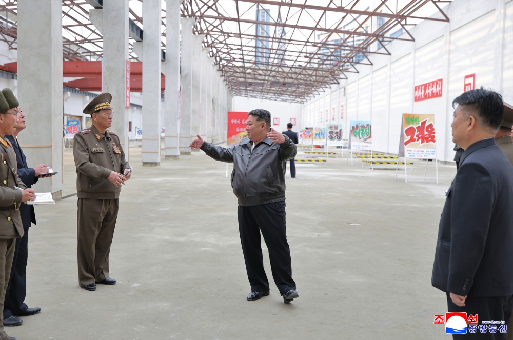 金正恩同志首先到学习用品厂建设工地了解工程计划进展情况后,视察了工地现场。