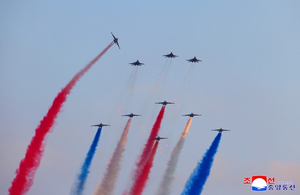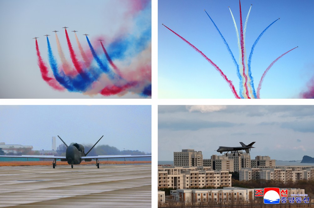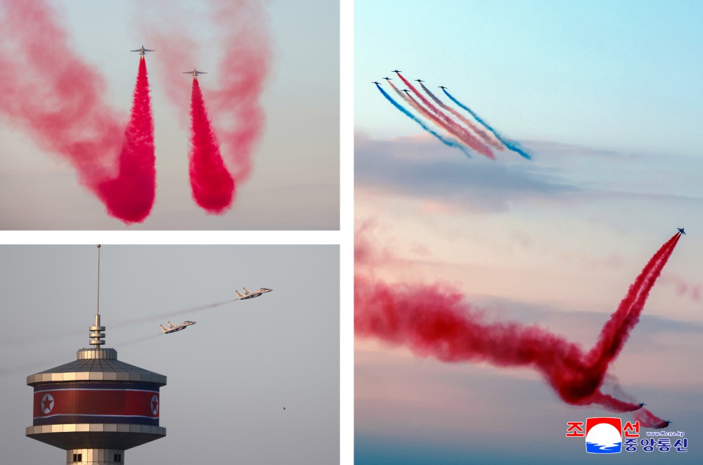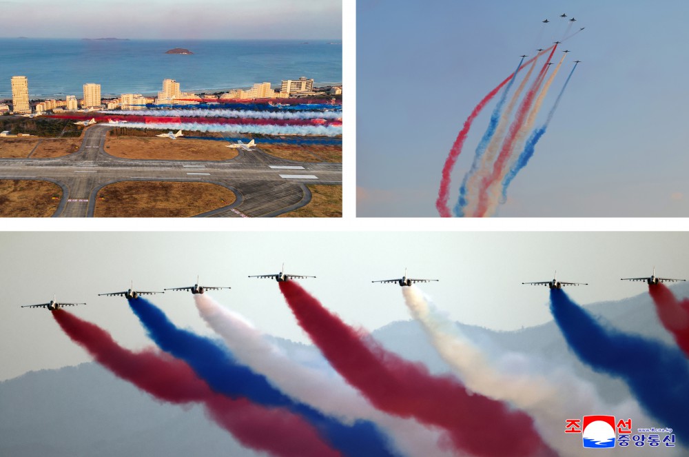 在意义深远的成立纪念日,在金正恩同志出席下进行示威飞行的空军飞行员们在祖国的蓝天飞出美丽的三色航迹,发射“礼花”弹,充分发挥了高超的驾驶技术。