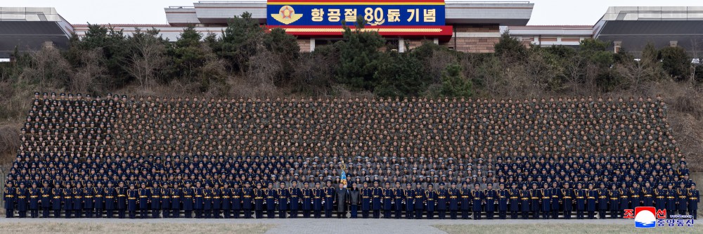 接着,金正恩同志同喜迎成立80周年的朝鲜人民军空军官兵合影留念。