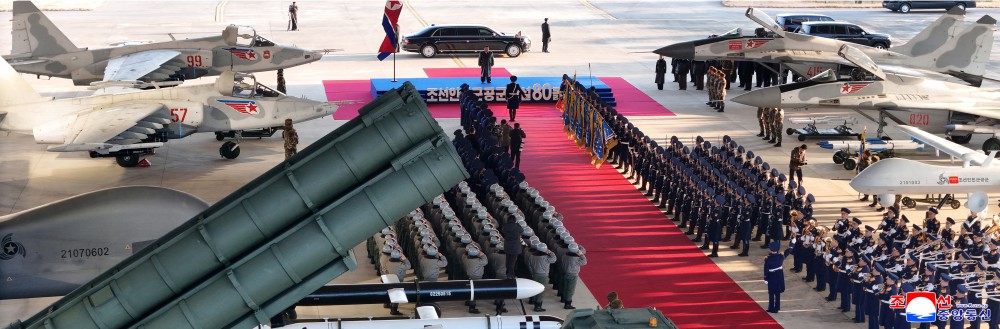 金正恩同志向以传奇式功勋熠熠生辉的朝鲜人民军空军和所属部队军旗表示战斗敬礼,并检阅了空军仪仗队。